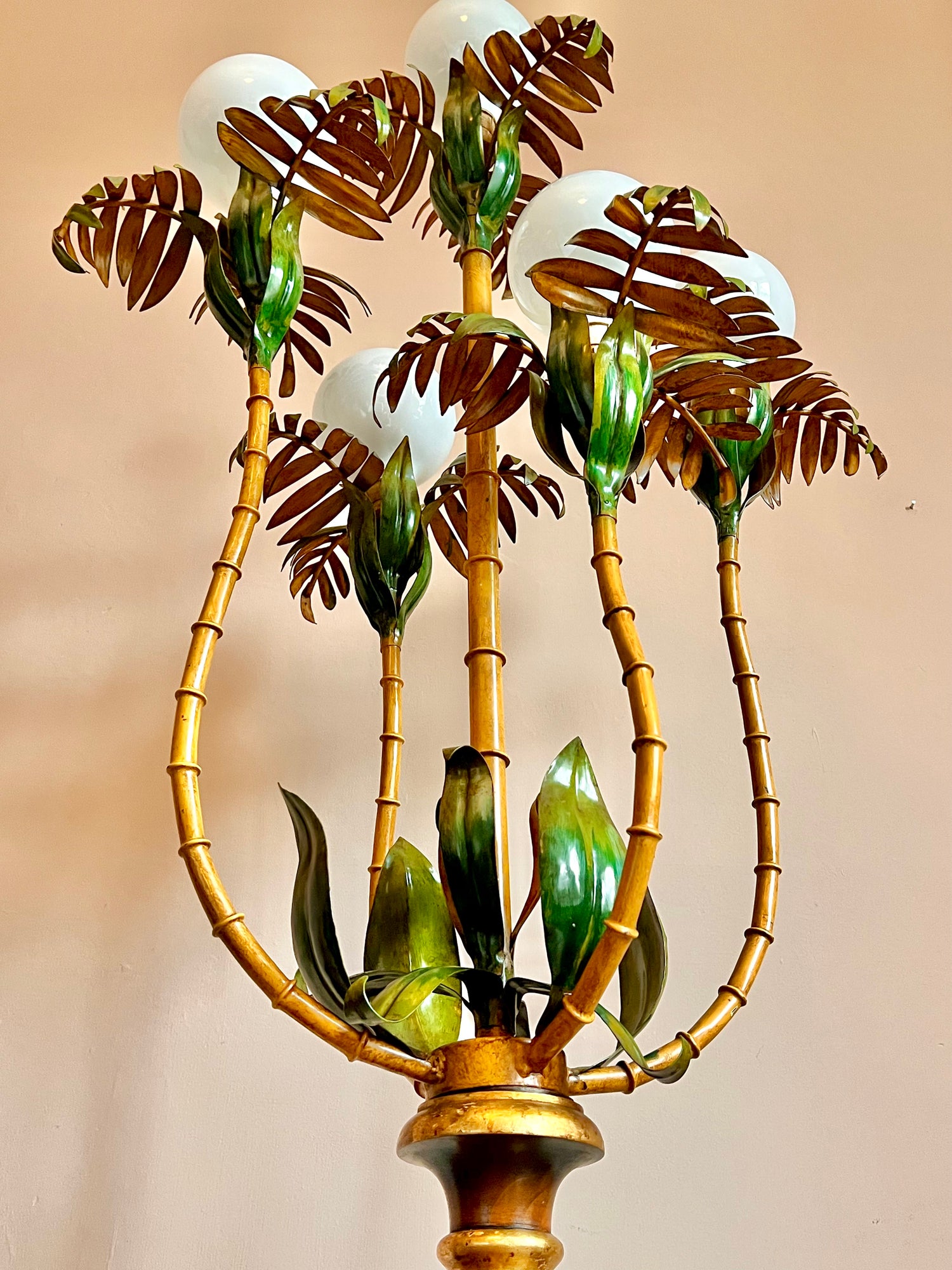 Superb and rare five-arm light with vibrant green and ochre hand-painted foliage and branches, mahogany base and gilt detailing. In excellent condition with light and attractive wear. The lamp has been rewired, fitted with dimmer floor switch and PAT tested. Supplied with five vintage style balloon bulbs.