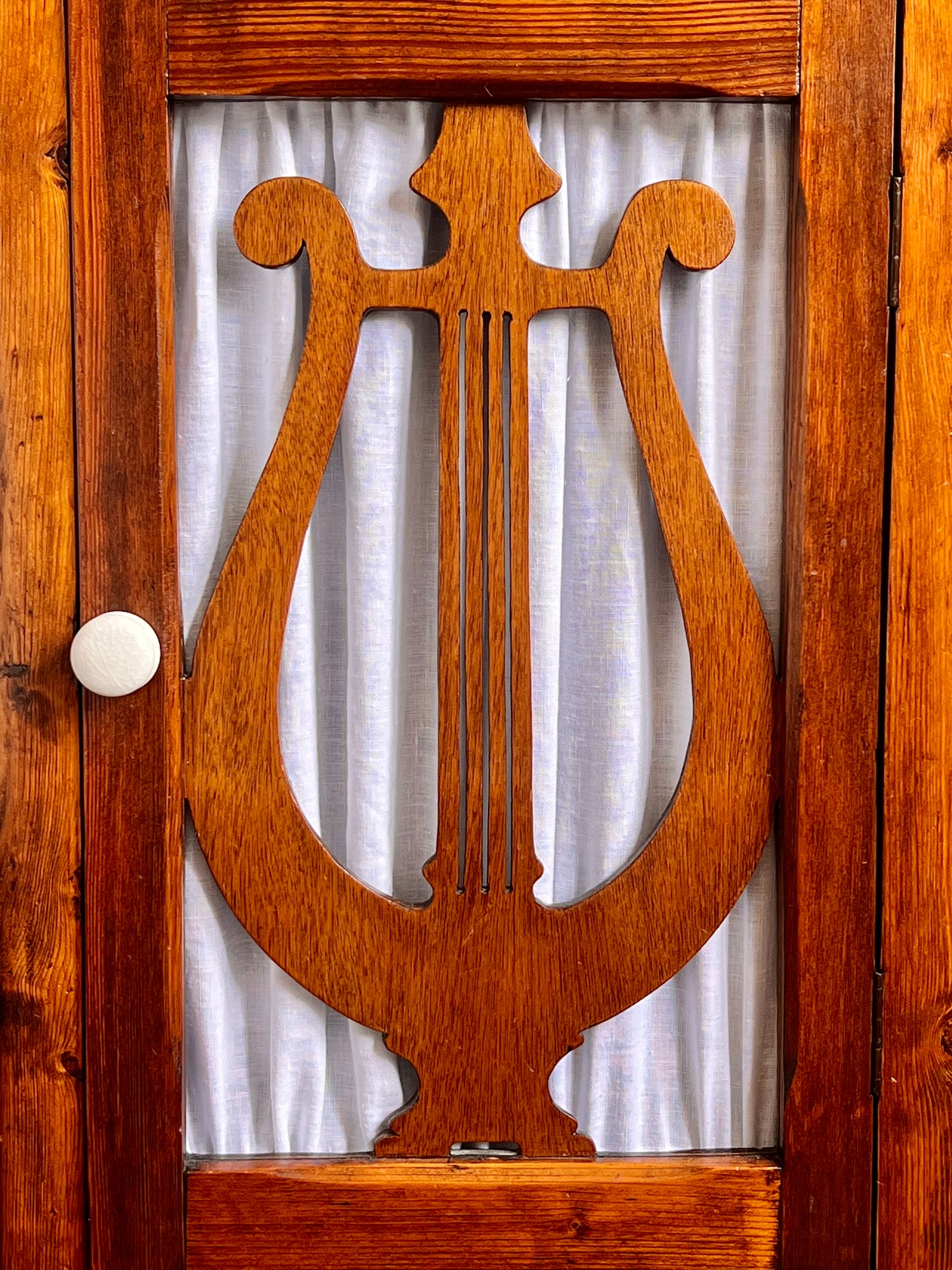 Beautifully rustic stained pine cabinet with clawed feet, linen curtain and ceramic knob.