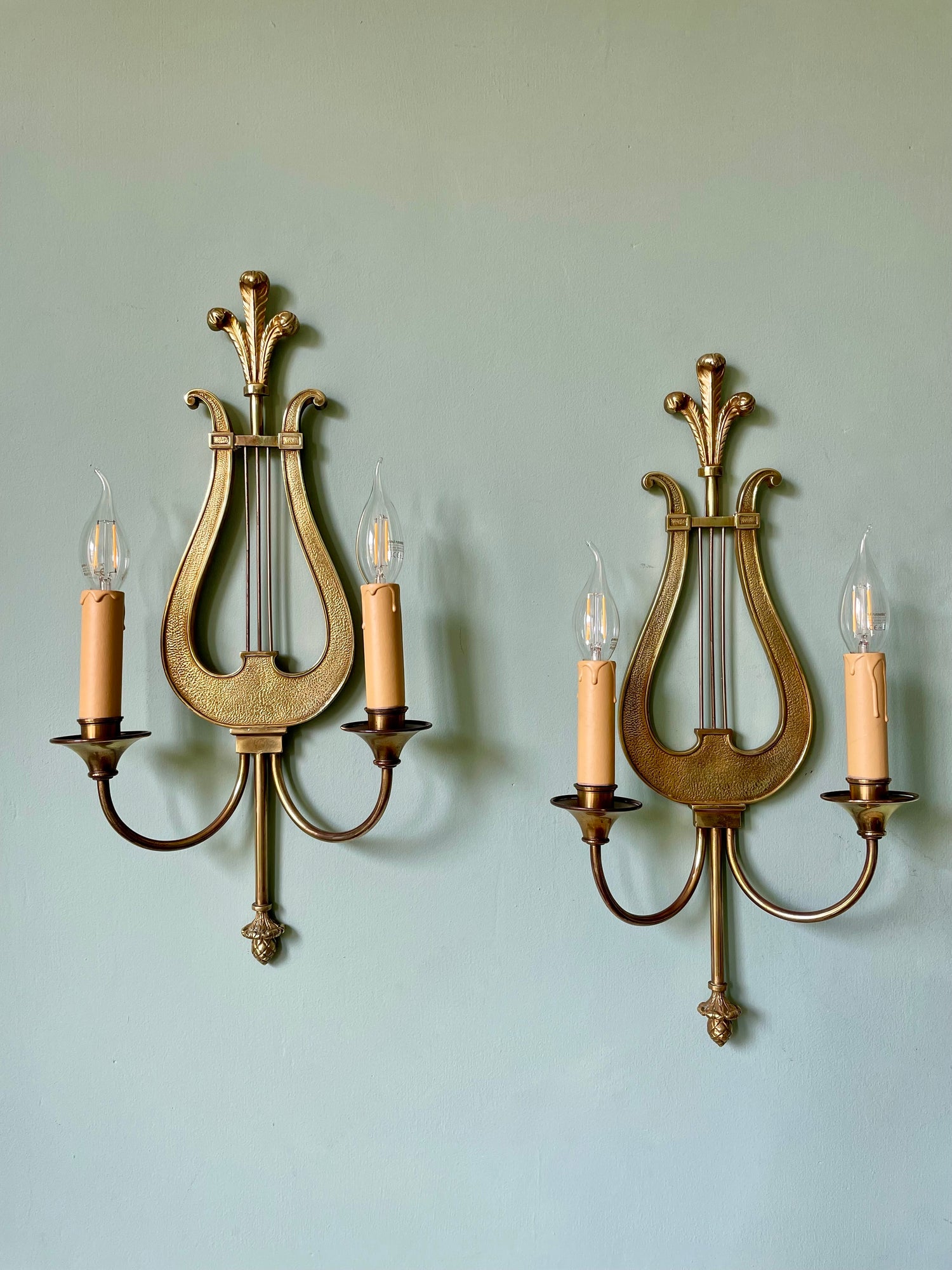 1950s Maison Charles (stamped & numbered) brass lyre wall lights.