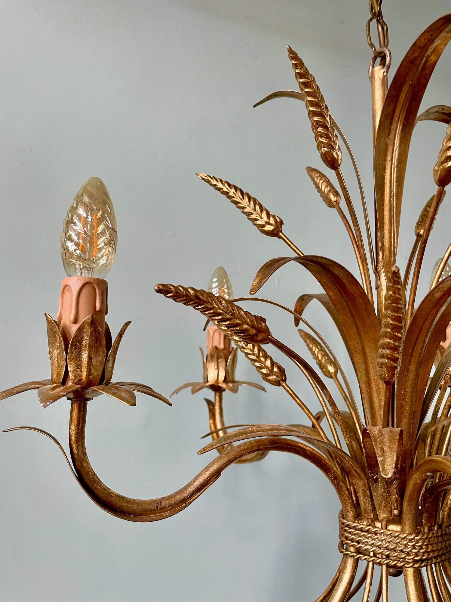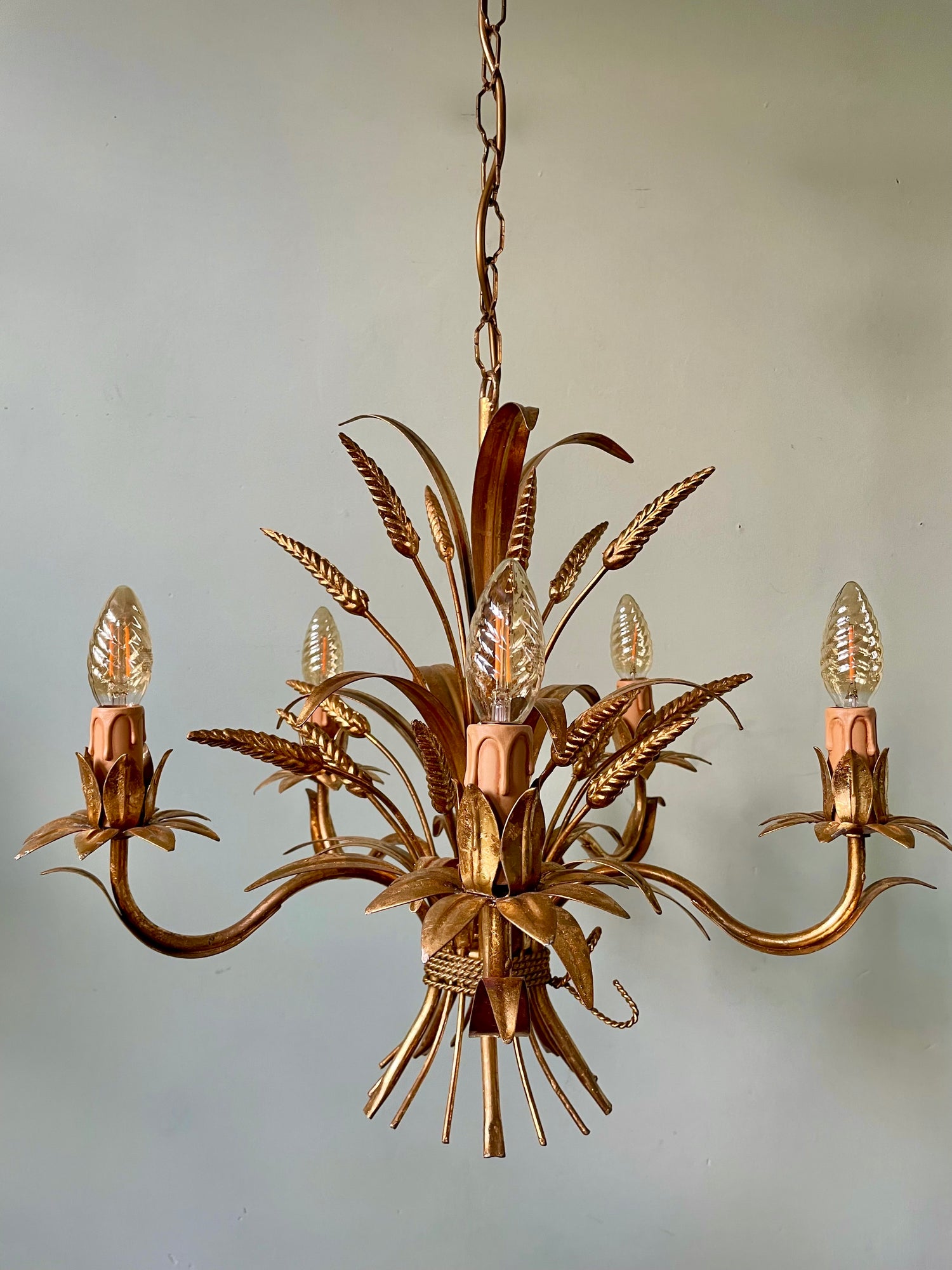 Beautiful five arm, gilt toleware light with scalloped ceiling rose and leaf 'drip trays'.