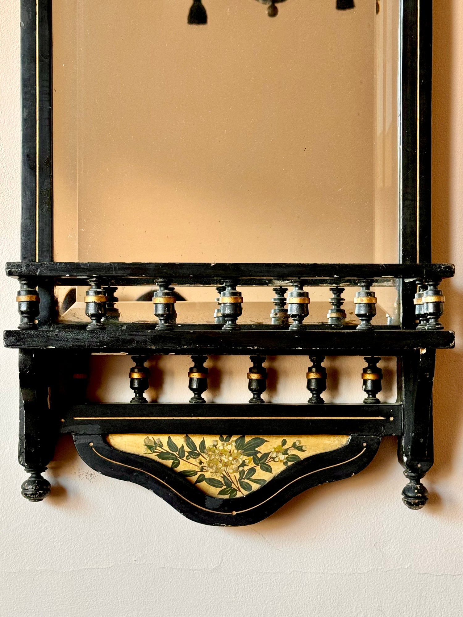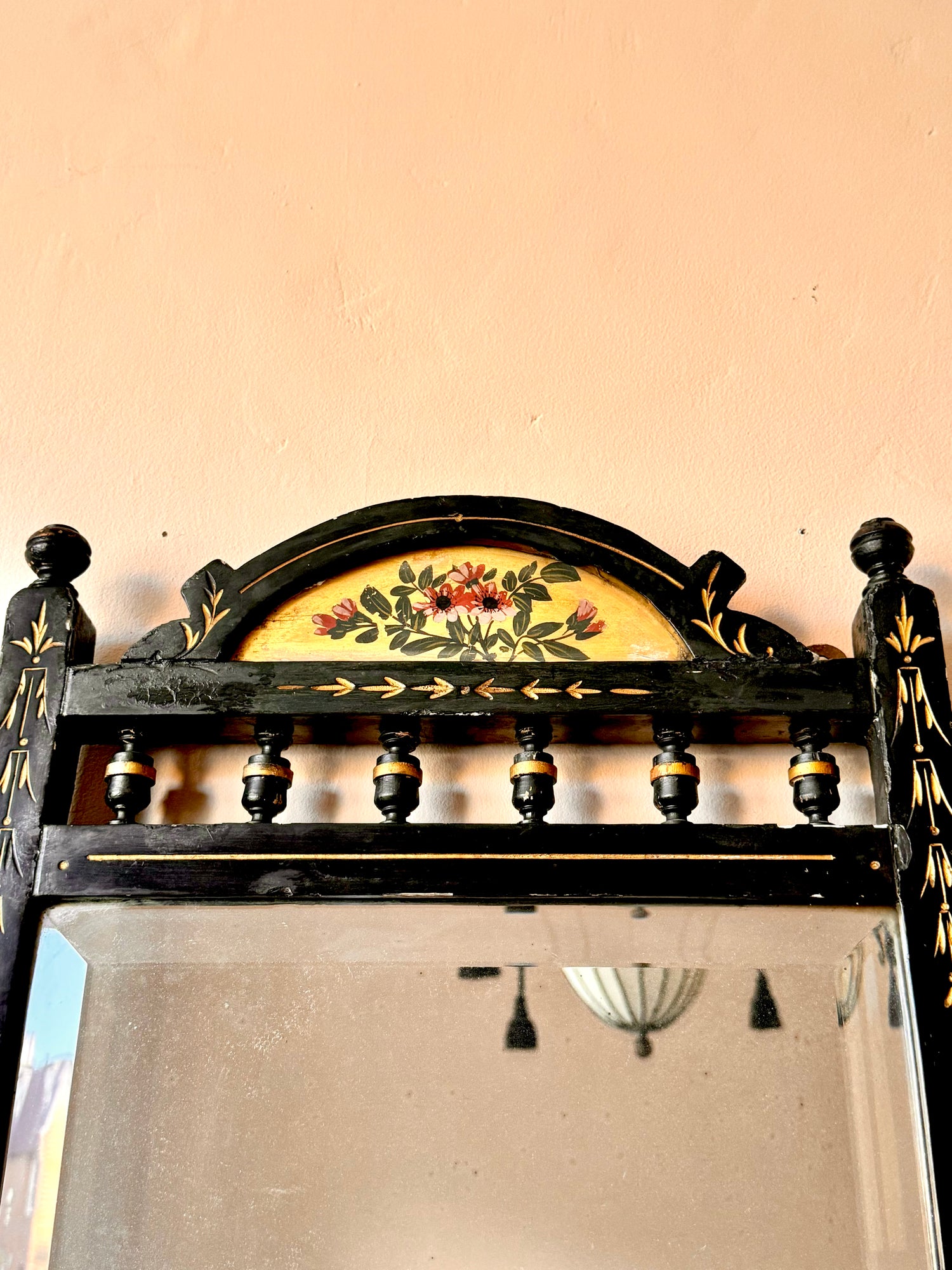 Gorgeous English bevelled mirror circa 1880 with gilt-embellished carvings and hand-painted floral inlays. In good solid condition with original back. There is moderate wear to the frame in places revealing the gesso coating beneath and areas where lacquer has been reapplied (please study photos).