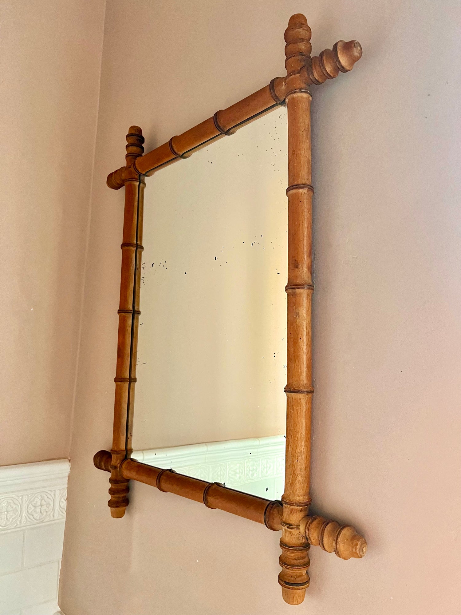 Wonderful turned fruitwood mirror with original back. In very good condition with attractive wear and foxing. The original mirror plate is slightly uneven as is common with glass of this age, but functions perfectly well.