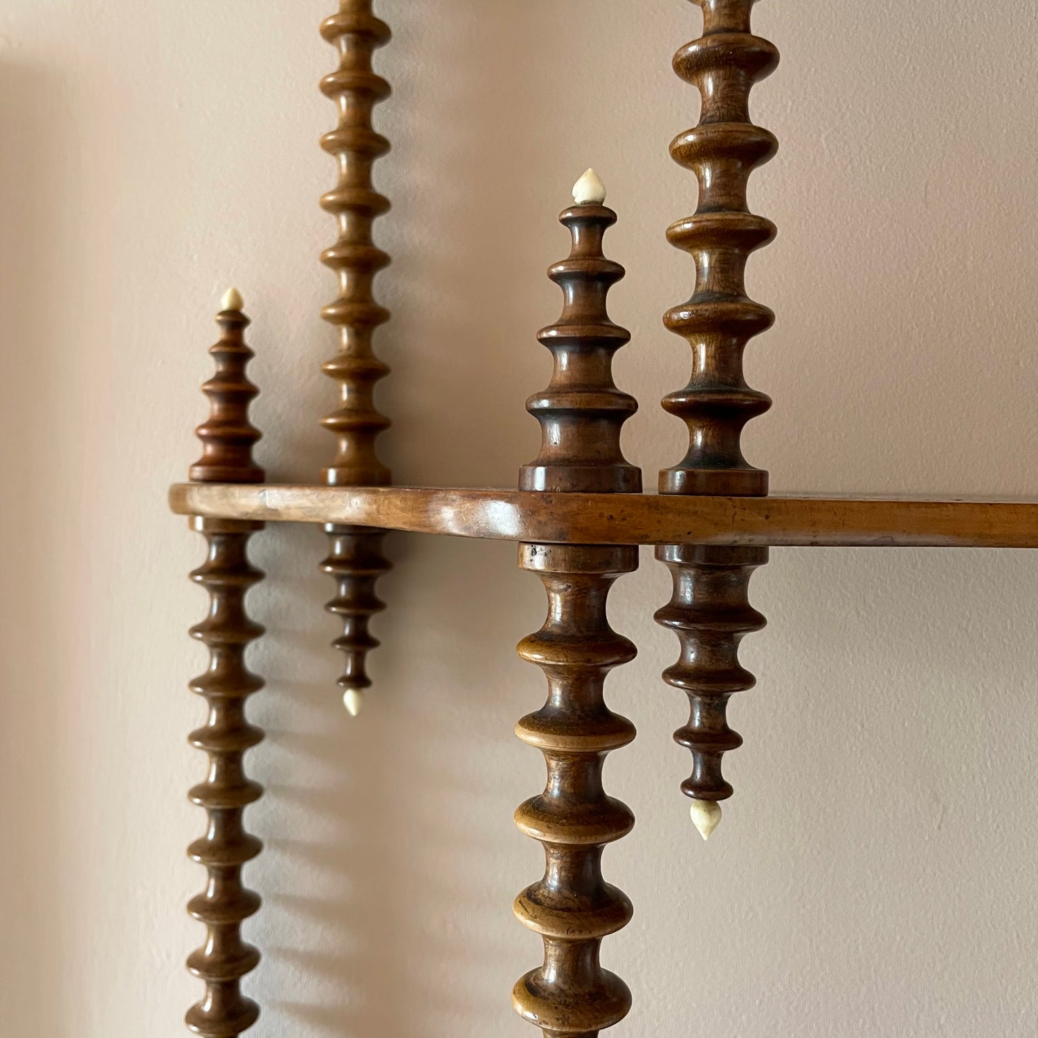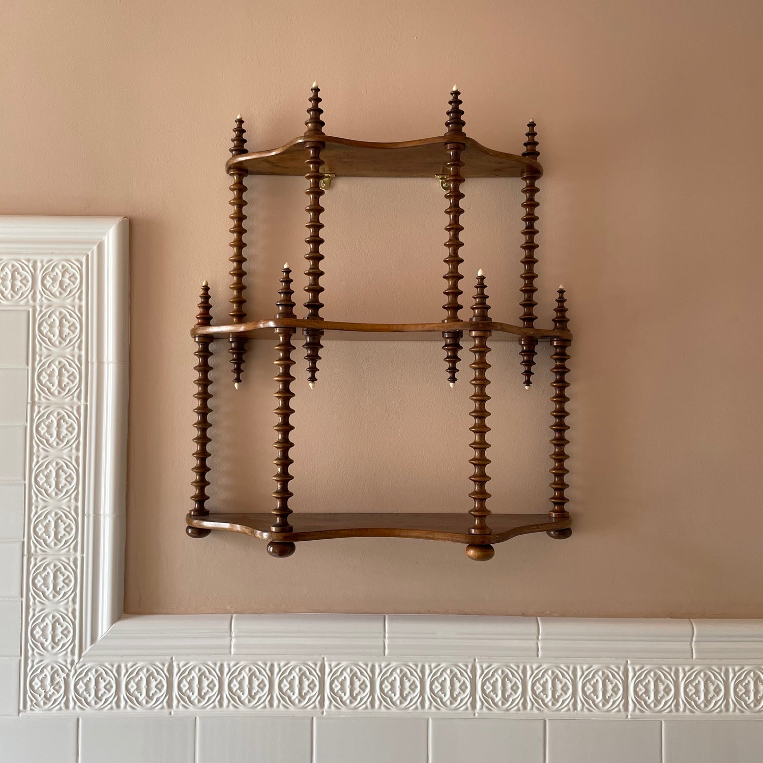 This rare and beautiful piece features milk glass finials and is excellent condition with one small candle scorch under upper shelf.
