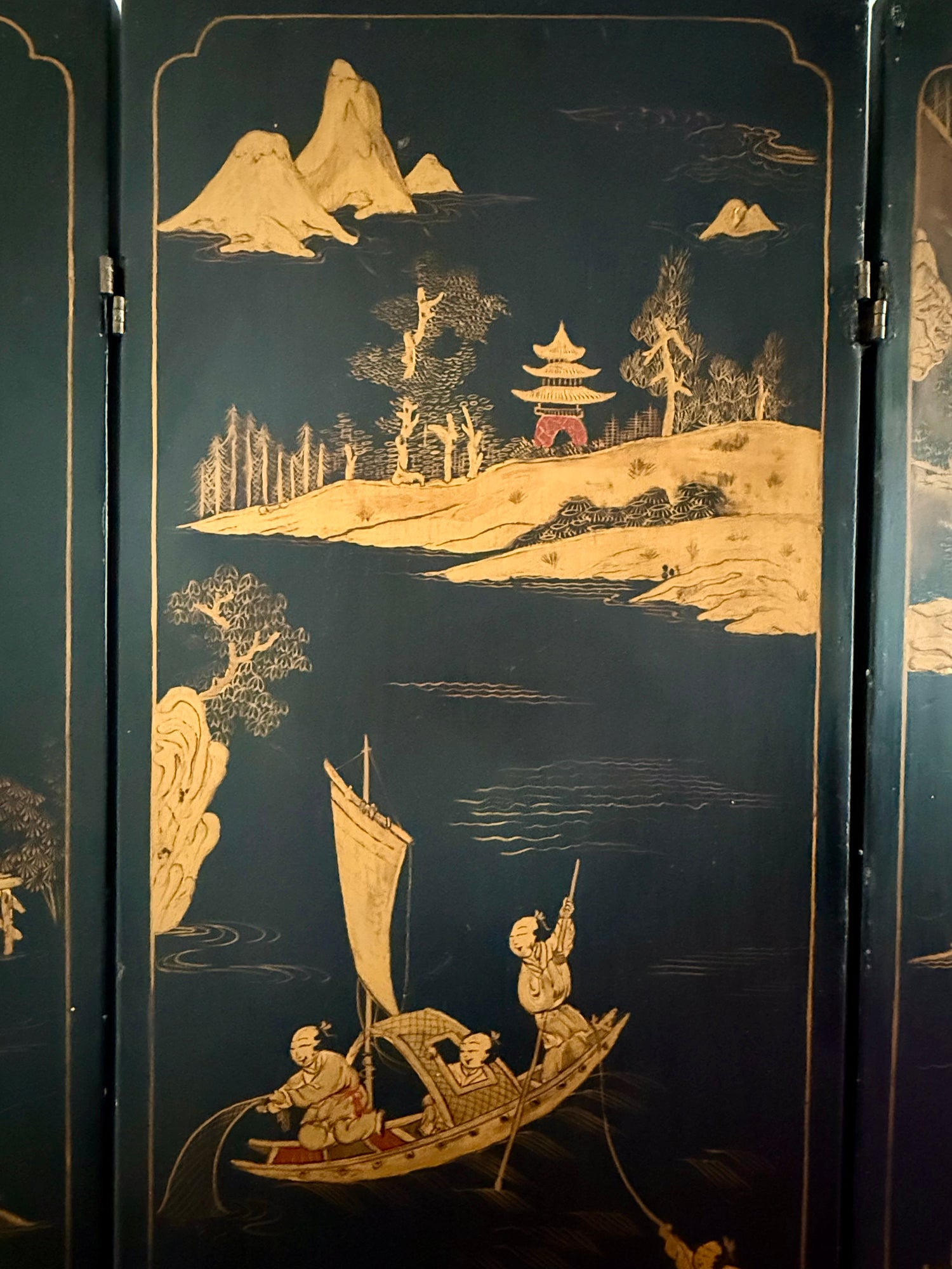 Exceptional three panel, hand-painted, room divider featuring tree and bird motifs on one side and a fishing village scene with floral arrangements on the other. In excellent, solid condition with light wear consistent with age.