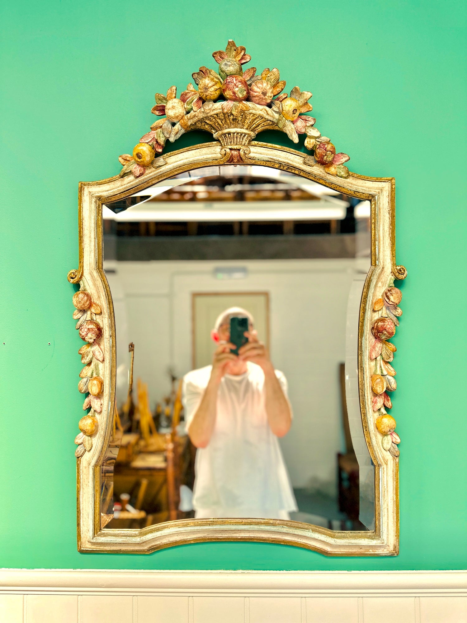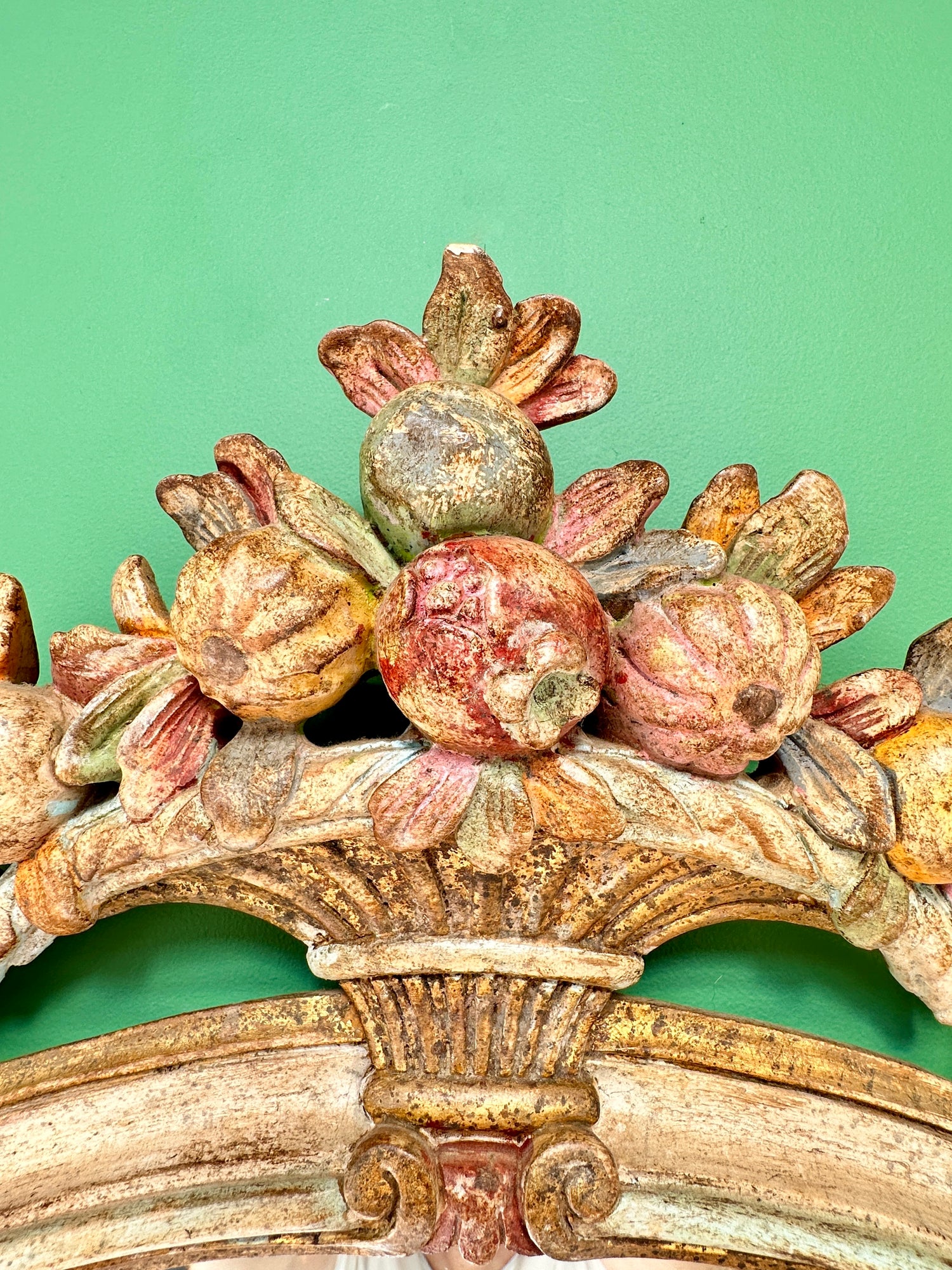 Beautiful carved wood bevelled mirror with urn & fruit crest and fruit & foliage border with gilt edging. In excellent condition with very light wear.