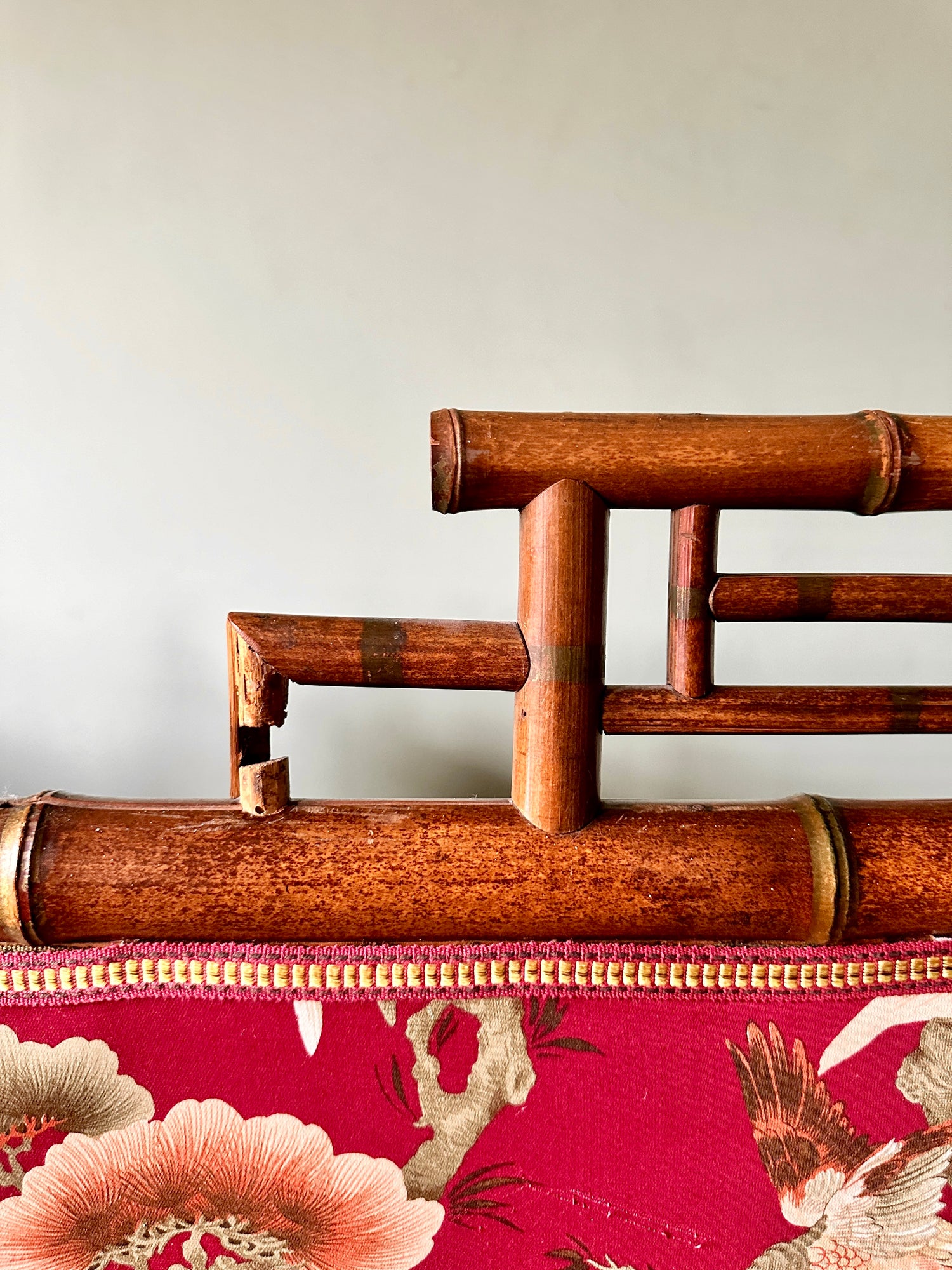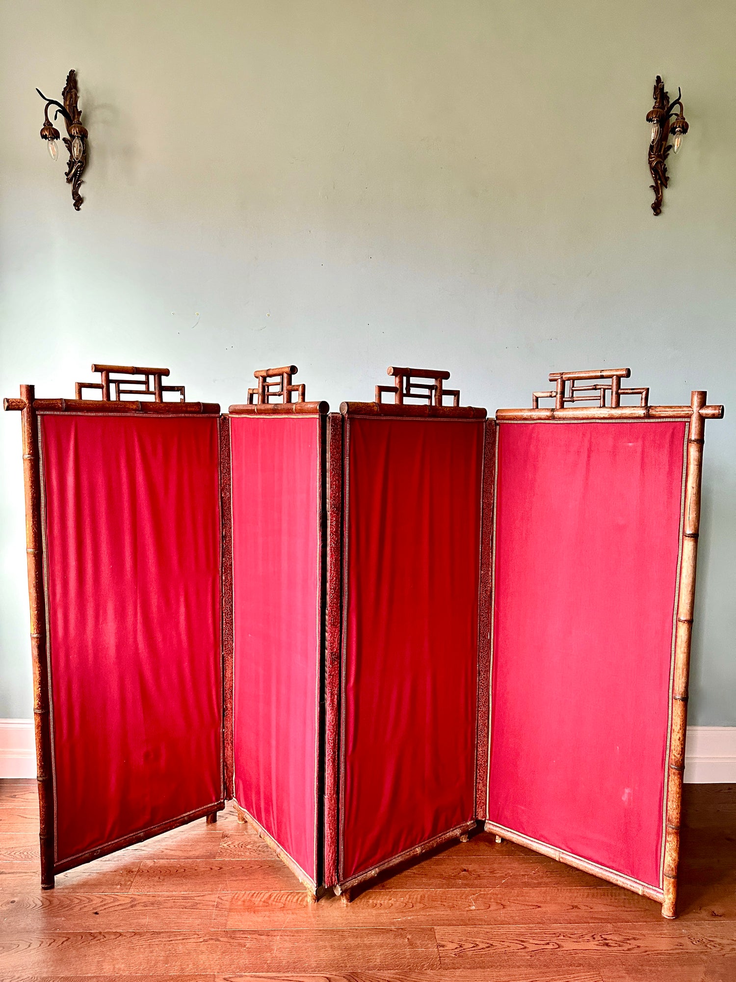 A truly superb four-fold room divider with silk panels depicting a forest scene with birds and flowers. Each panel features a bamboo crown with faded gilt details, embroidered edging and decorative, fabric covered hinges. The screen is in very good and sturdy condition with some wear consistent with age. A few circular bamboo caps are missing and there is wear to two of the feet, but the screen is solid and very sturdy. The front silk panels, which were added in the 1920s, are in excellent condition.