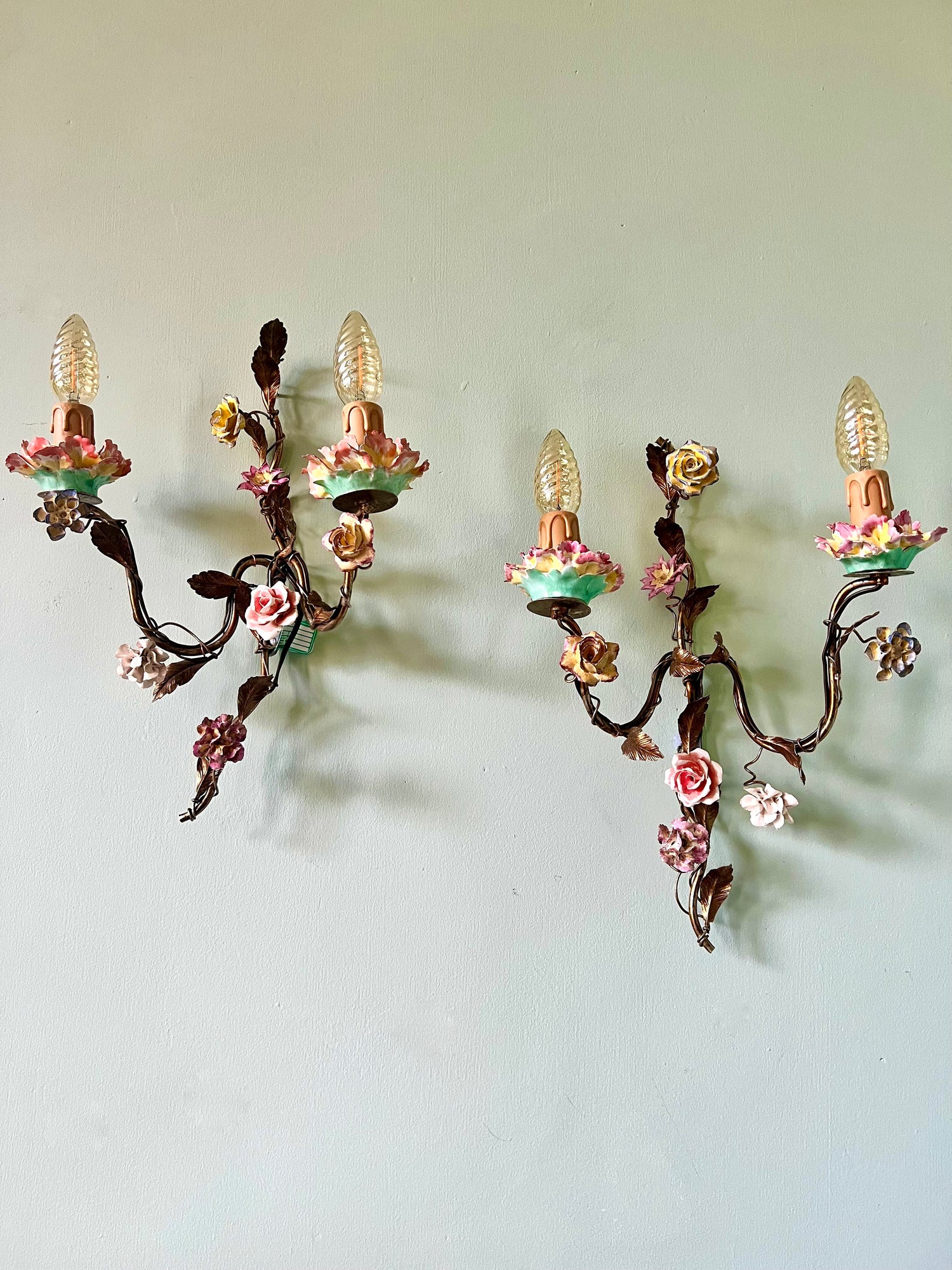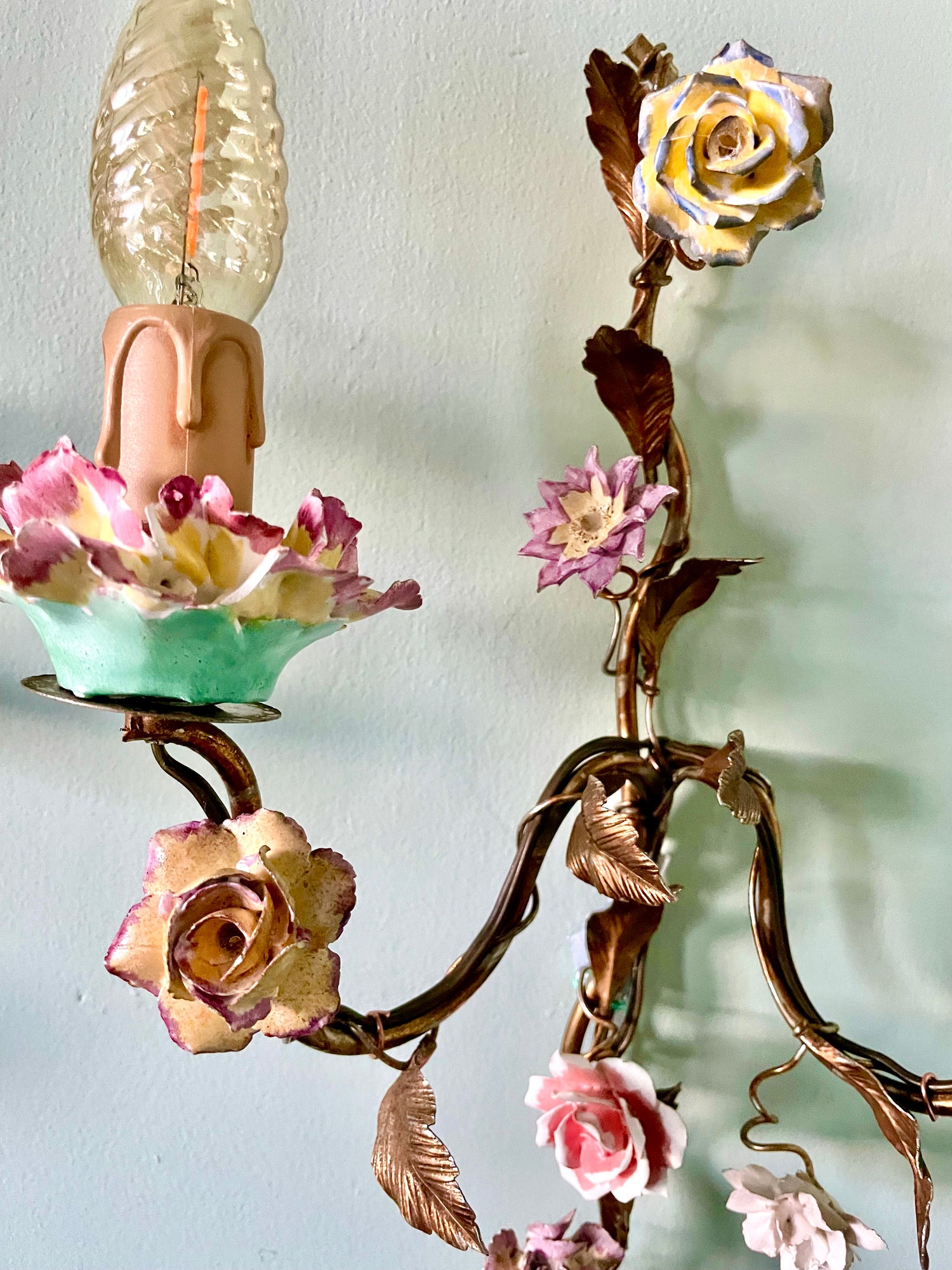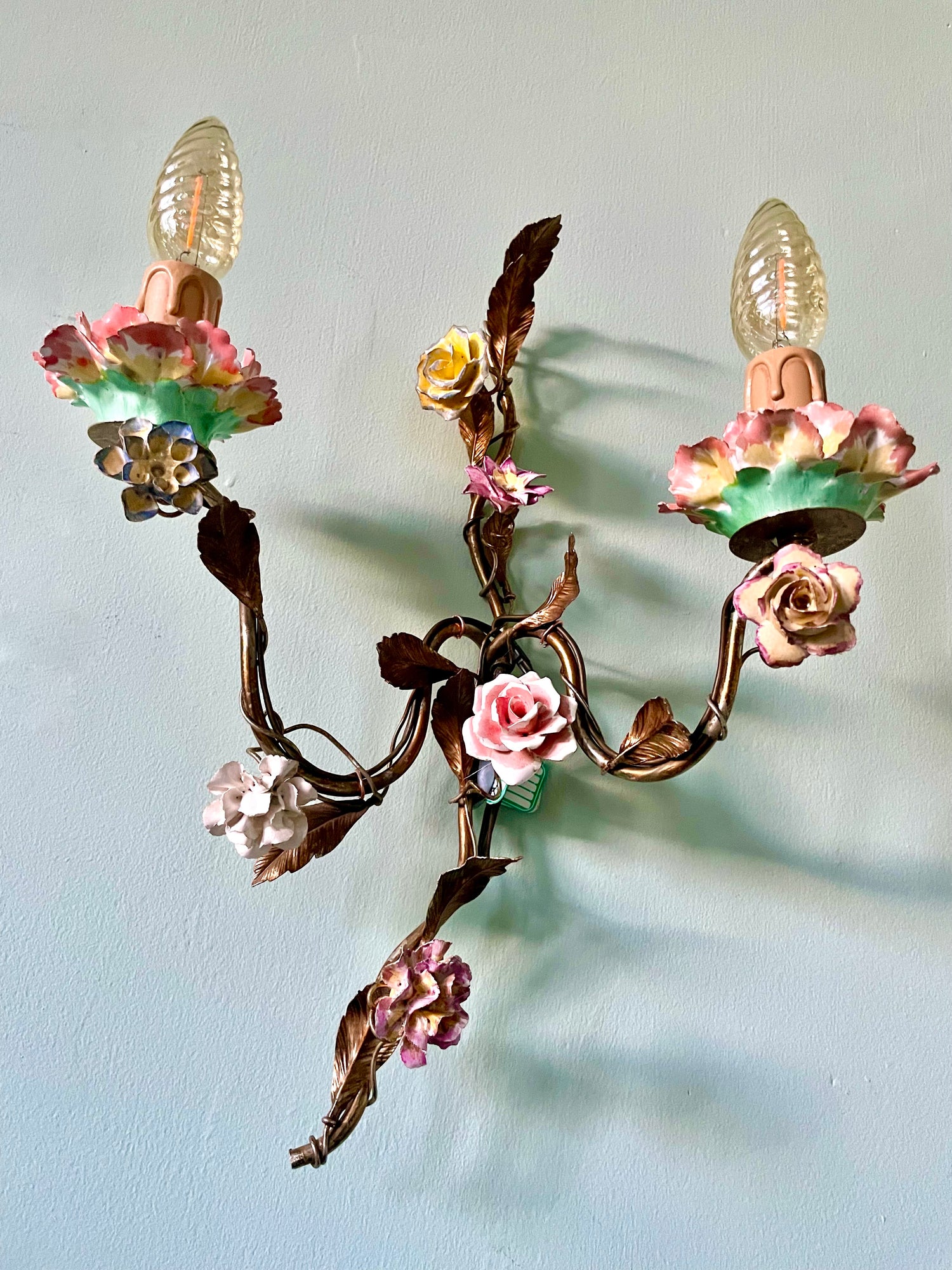Exceptionally beautiful hand-painted sconces with delicate porcelain flowers and gilt leaves. In very good condition, both lights have been rewired, fitted with new bulb holders & sleeves and PAT tested. The finely crafted ceramic flowers are in great condition, but can only be hand delivered (please see options at checkout).
