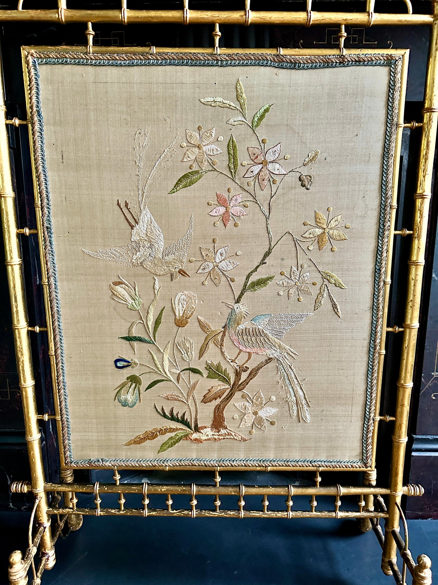 Magnificent faux bamboo and hand embroidered silk screen in the Japanese style circa 1860. In very good and sturdy original condition with light and attractive wear. A few historic and treated worm holes, but almost not worth mentioning. One minor missing piece at rear of base (see photo).