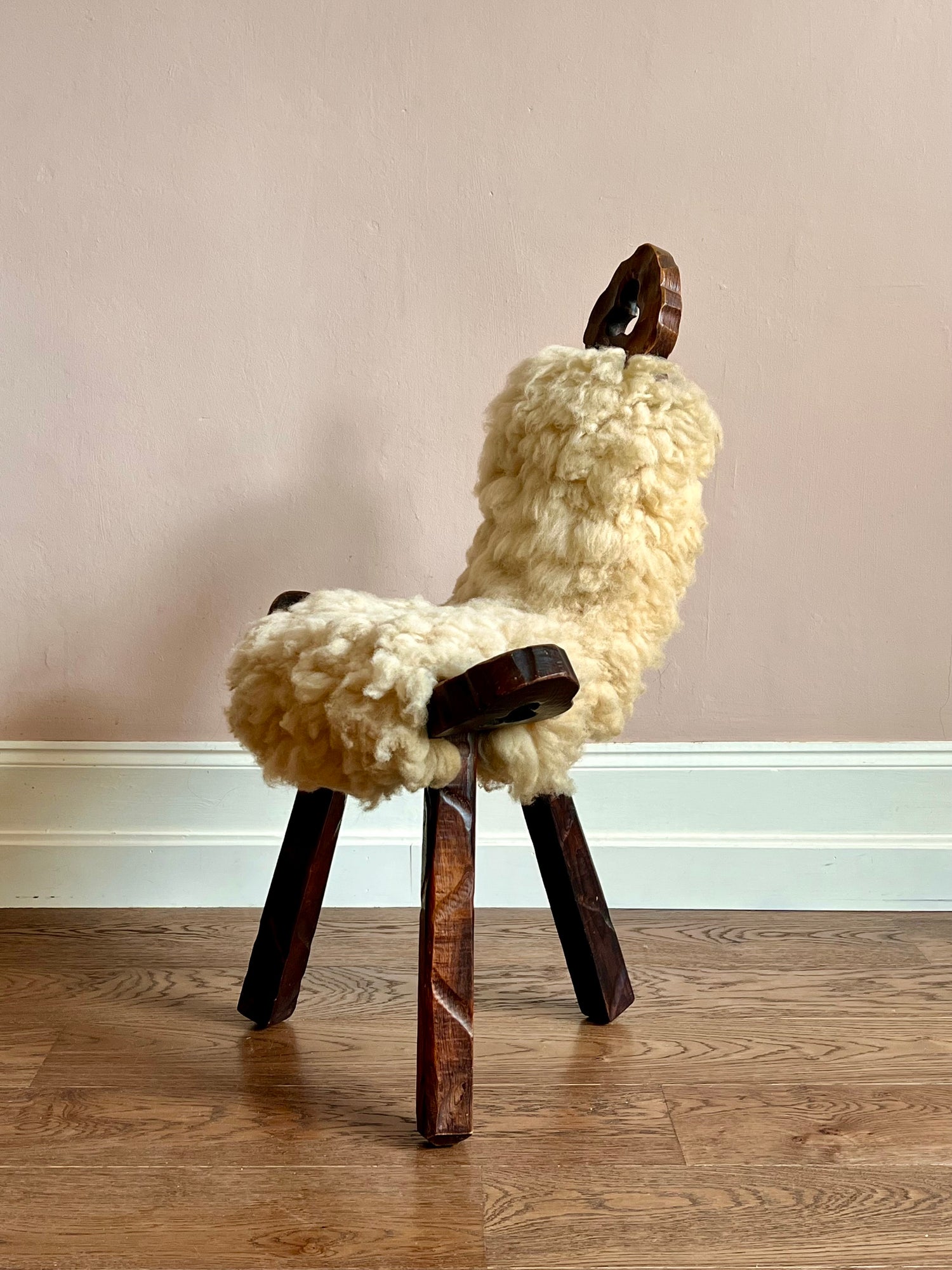 Wonderful and unique sculpted chair with natural, undyed sheepskin seats and backs. In excellent, sturdy condition with very minor wear.