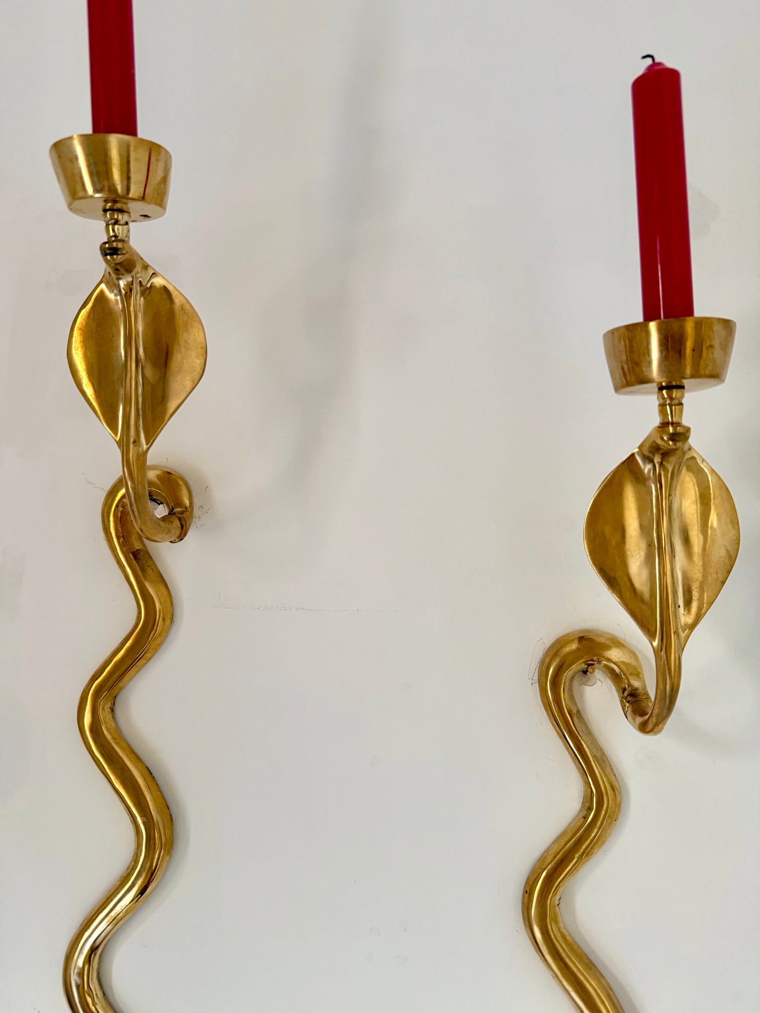 Superb pair of solid brass candleholders. In excellent condition with a small casting imperfection to the rear of one candleholder (see photo - not visible visible when hung).