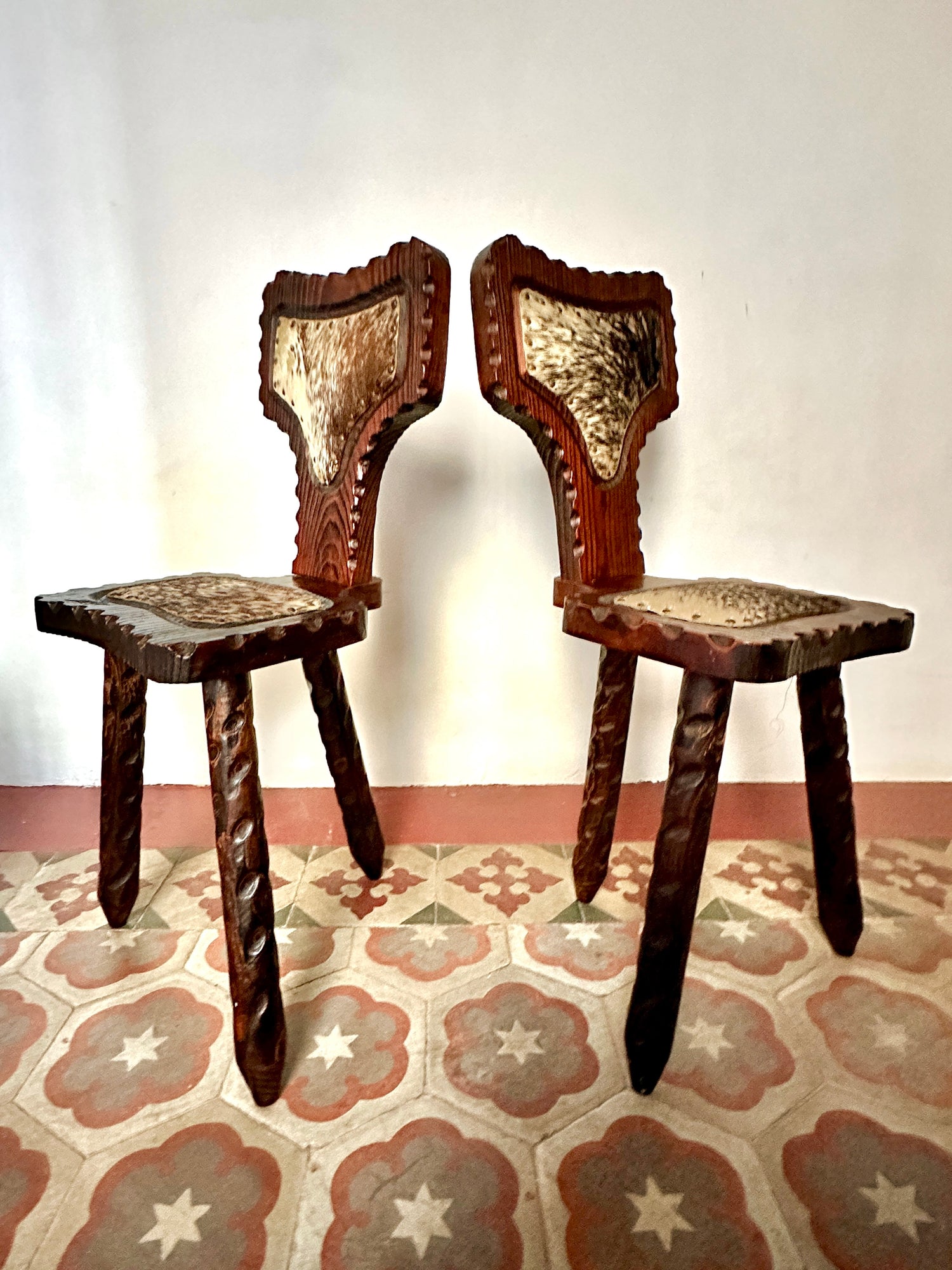 Superb hand-carved pine chairs with goat skin seats and backs. In excellent and solid condition with light wear.