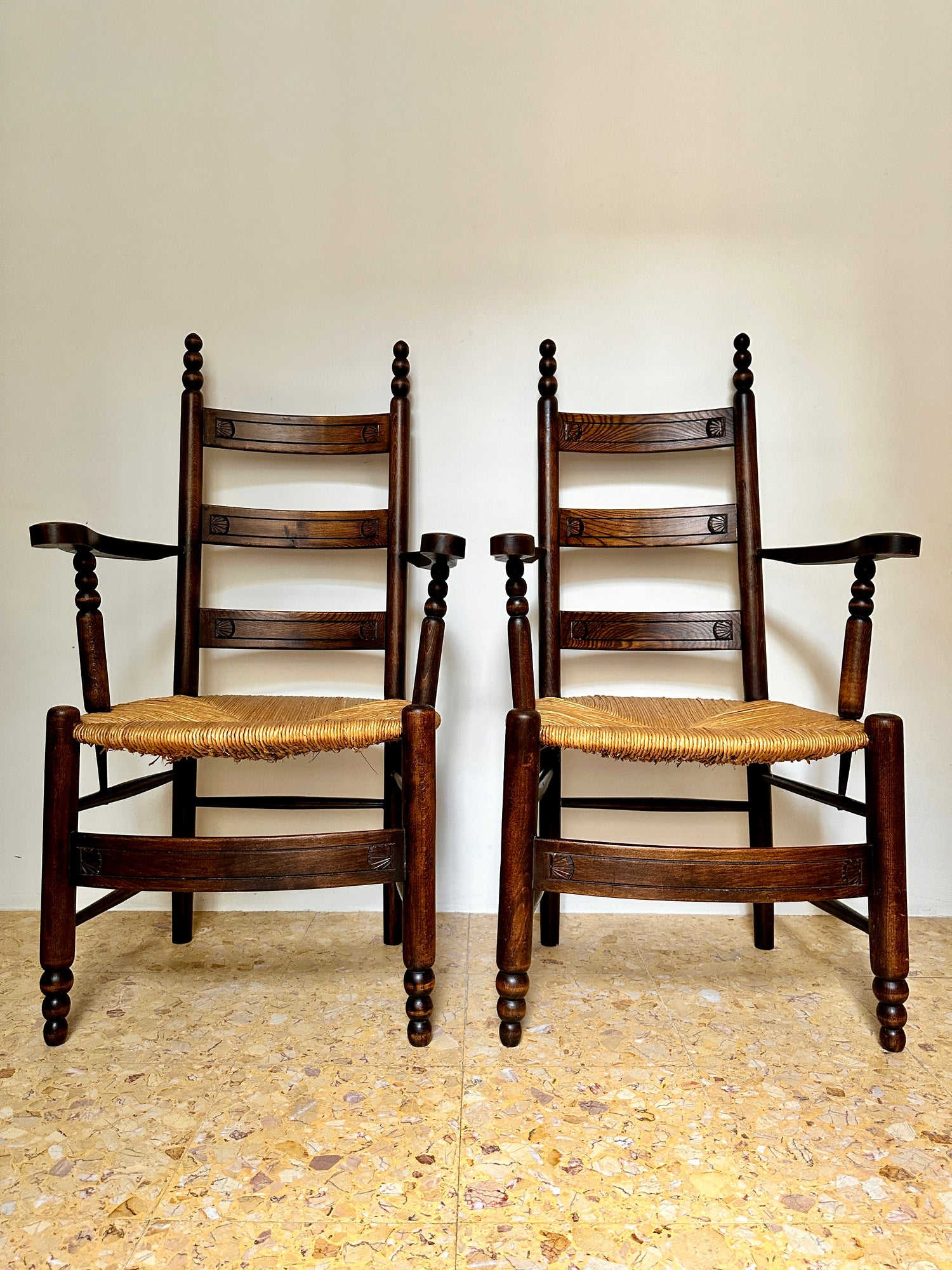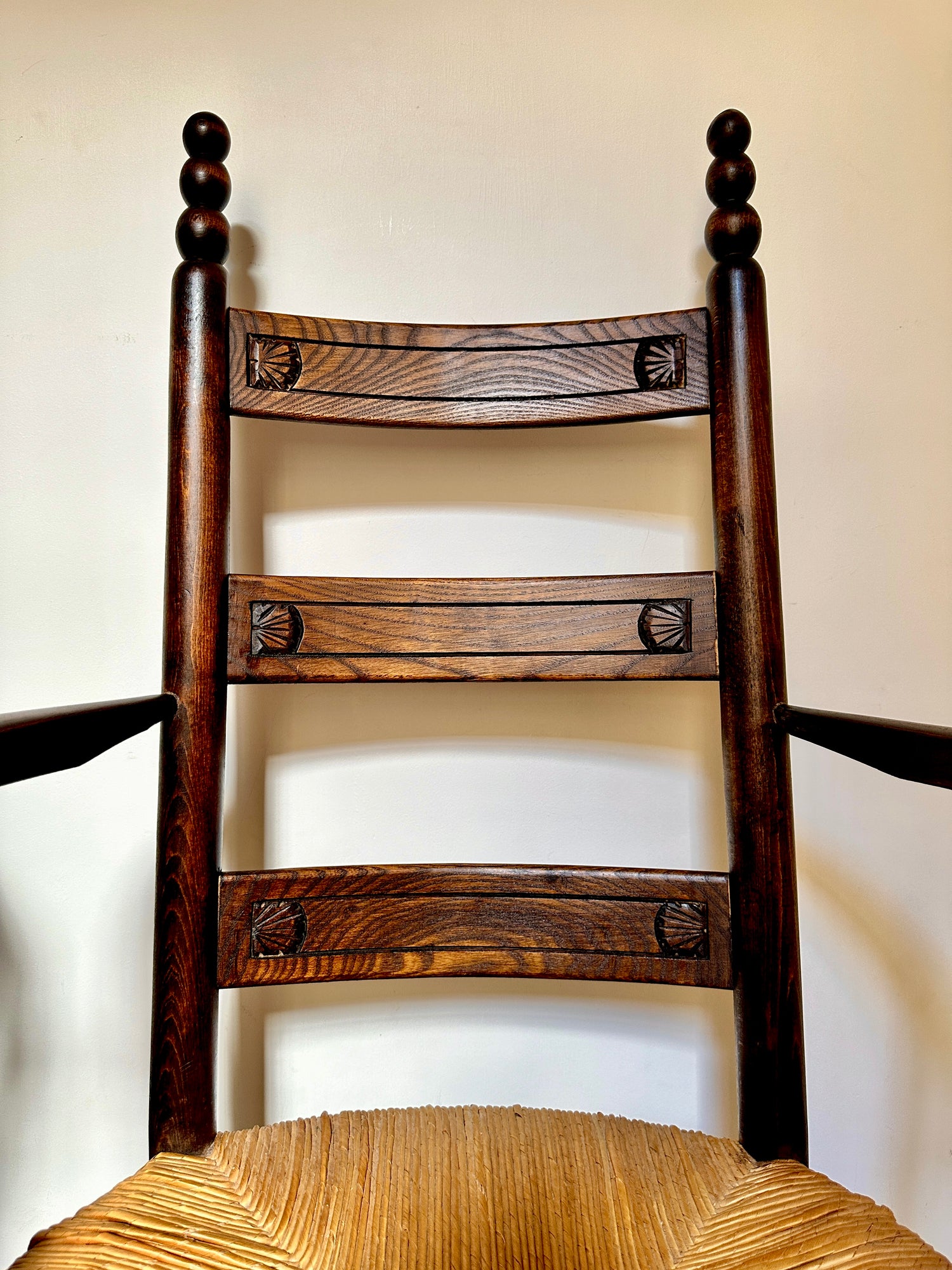 Superb oak and rush seat chairs with bobbin ears, feet and arm supports. The front stretchers and ladder backs feature carved scallop shell motifs. In excellent and solid condition with very little wear.