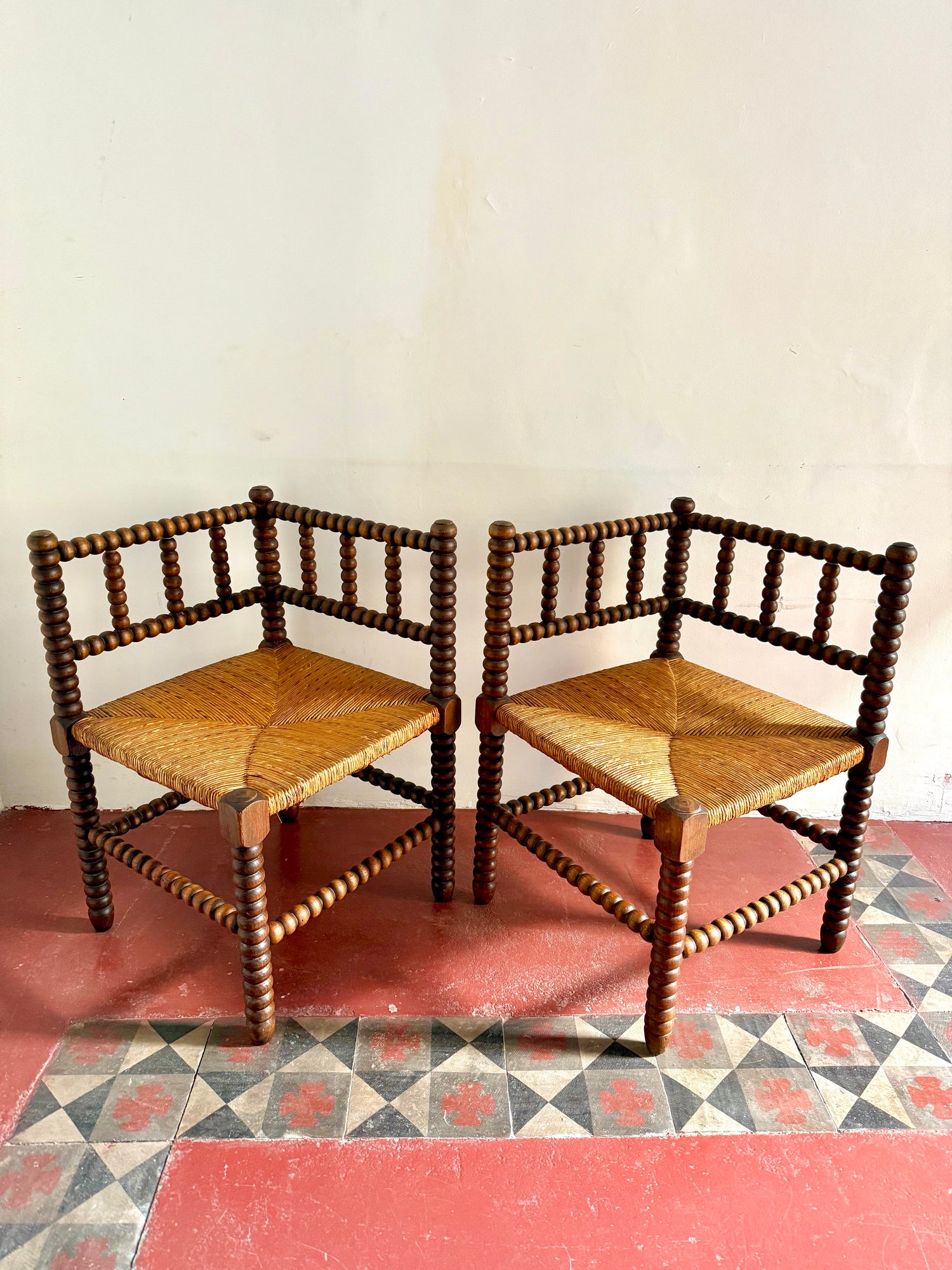 Pair of Early C20th French bobbin corner chairs.