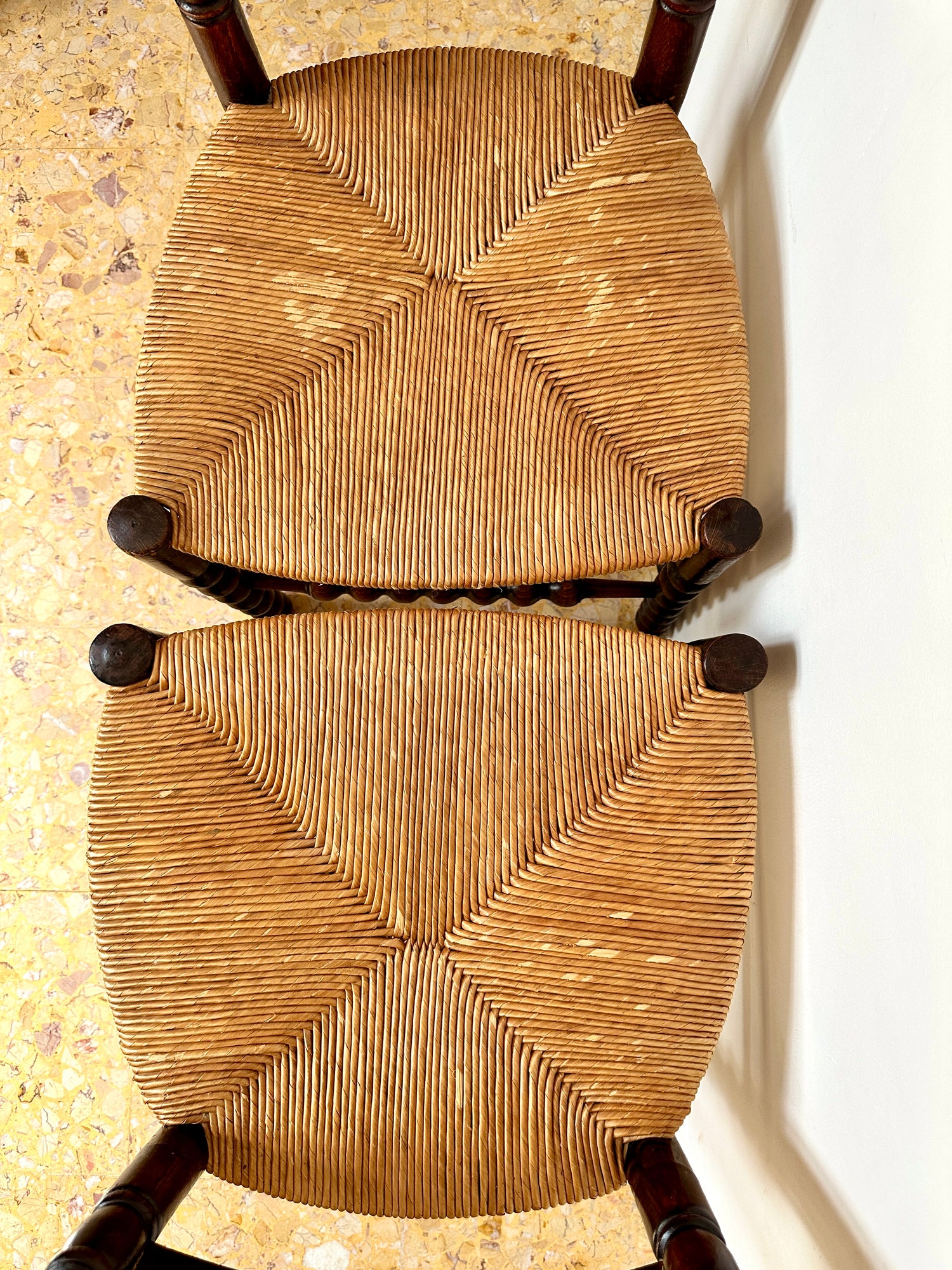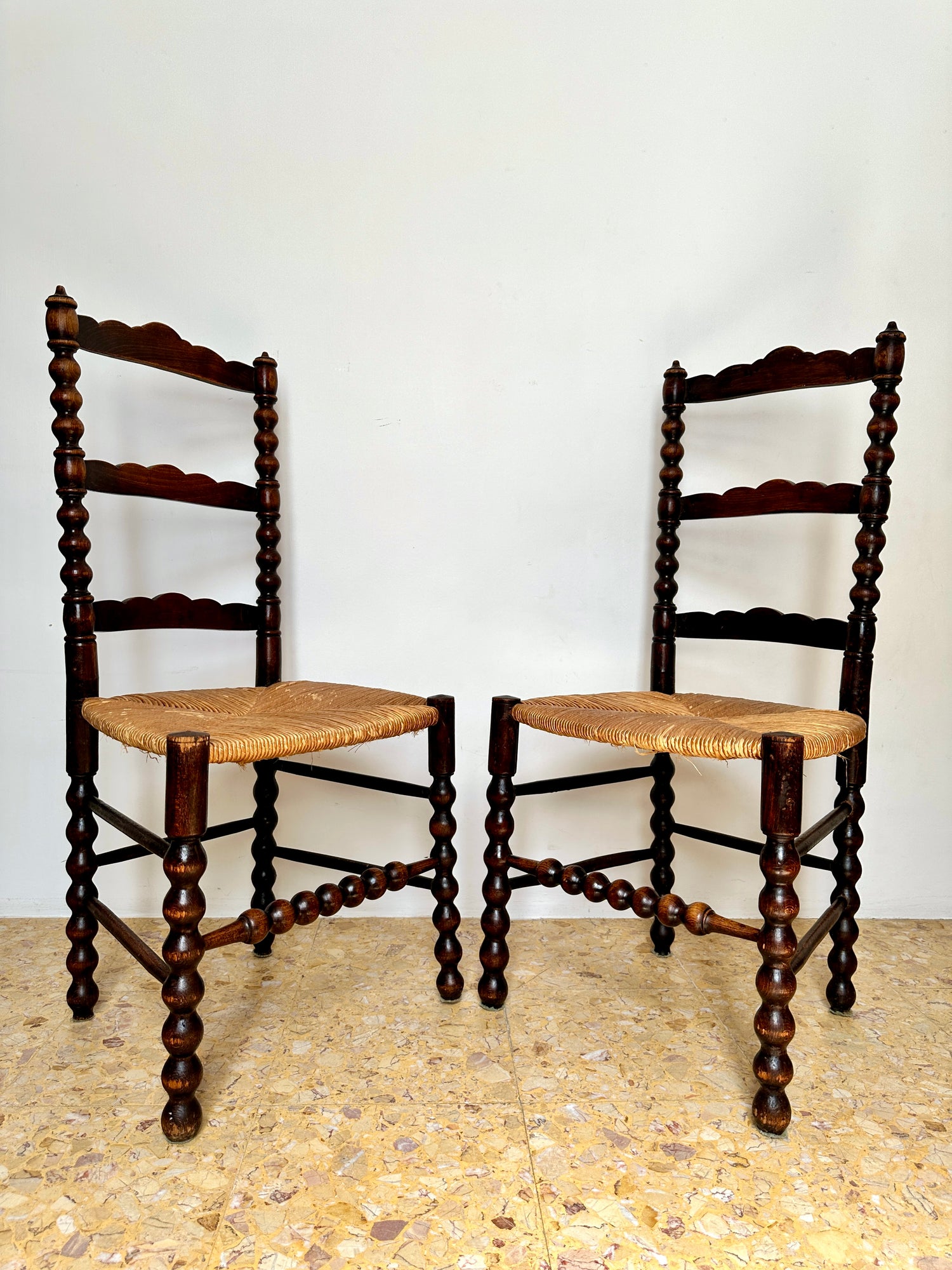 Beautiful 1940s turned oak chairs in very good, sturdy condition with wonderful age-related wear. The seats are slightly lower than standard dining chair heights and are more suitable for the hallway, bedroom or bathroom.