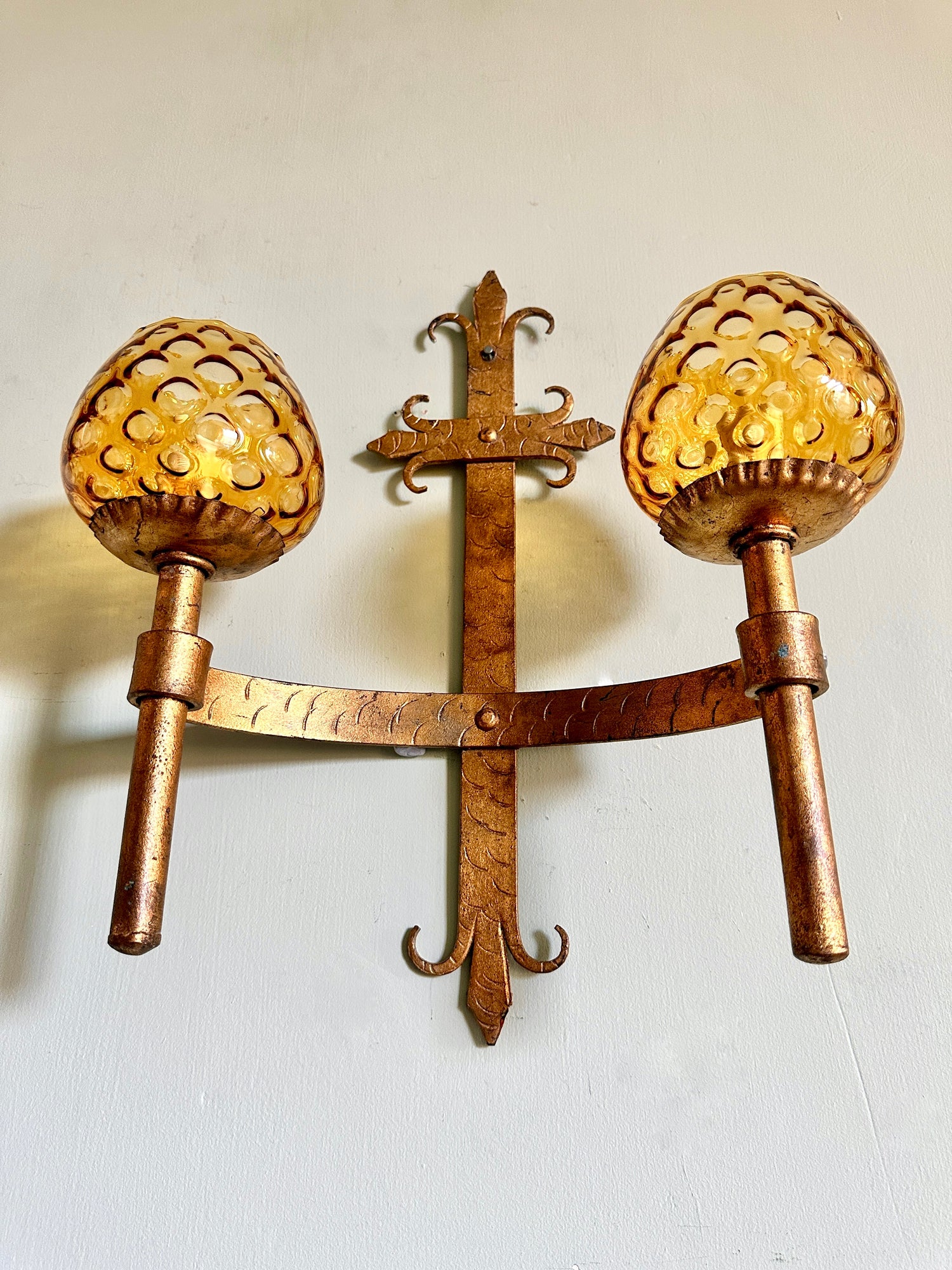 Wonderful 1940s hand-wrought iron sconces with gilt coating and amber hand-blown glass shades. In excellent condition with beautiful patina. The lights have been rewired and are ready to use.