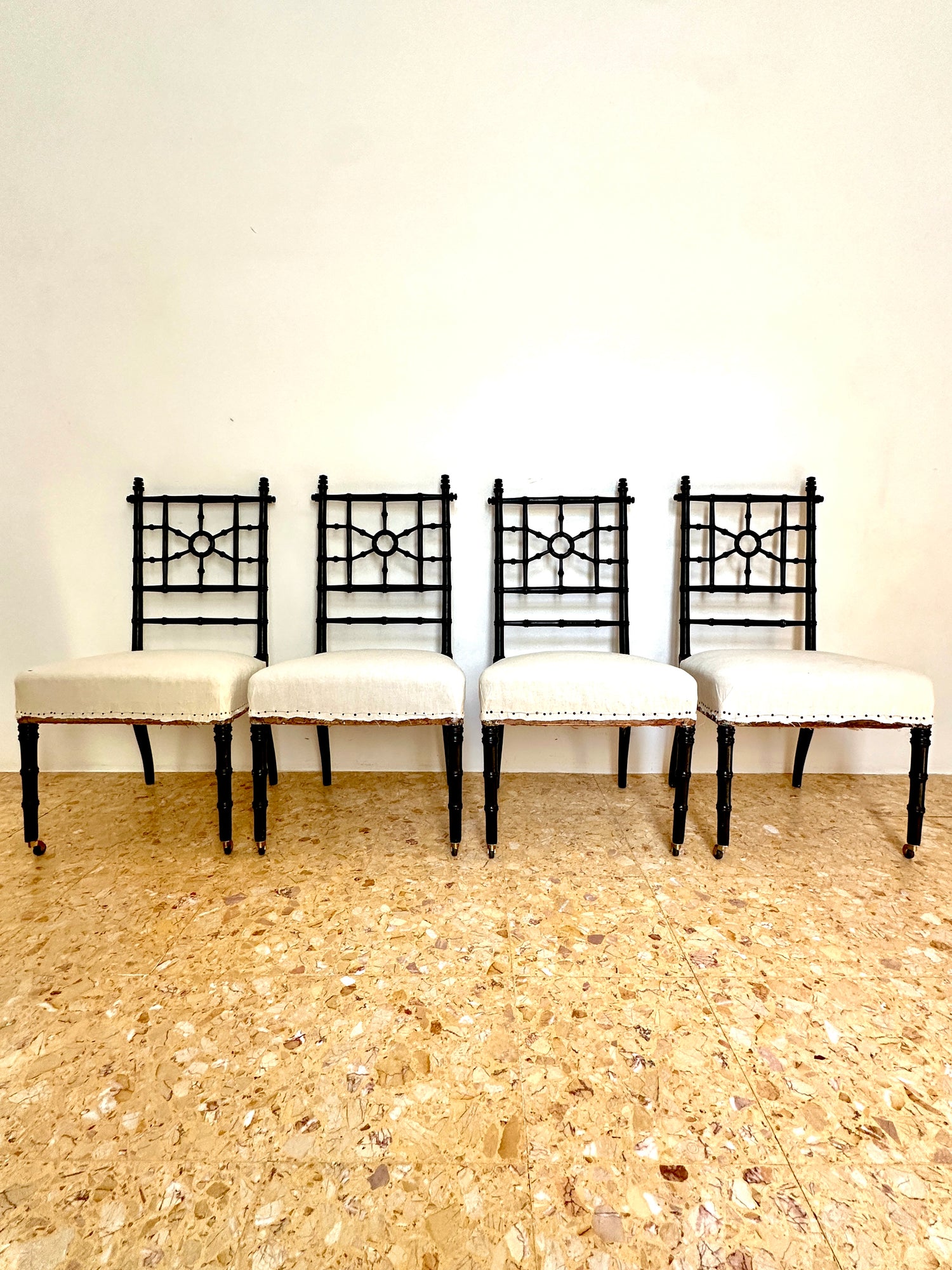 Set of four lightly lacquered Napoleon III faux bamboo chairs.