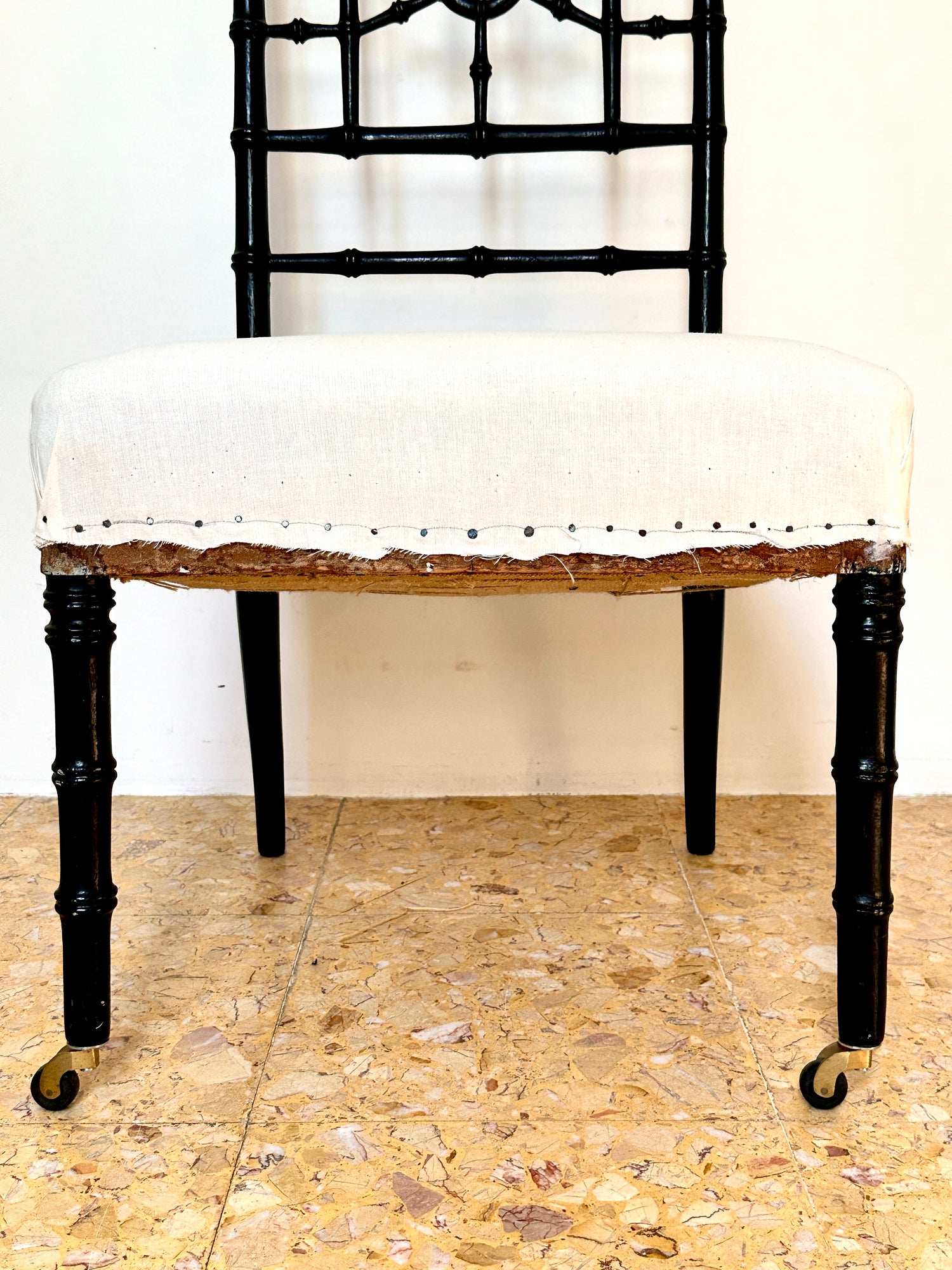 Fully restored C19th chairs with new brass castors, horse hair padding, webbing, springs and calico fabric base. Ready for reupholstering (or not!). The chairs have been refinished at some stage with a light lacquer coat. In excellent and solid condition with some light very light wear. One chair has a 10mm black measuring mark on calico fabric.
