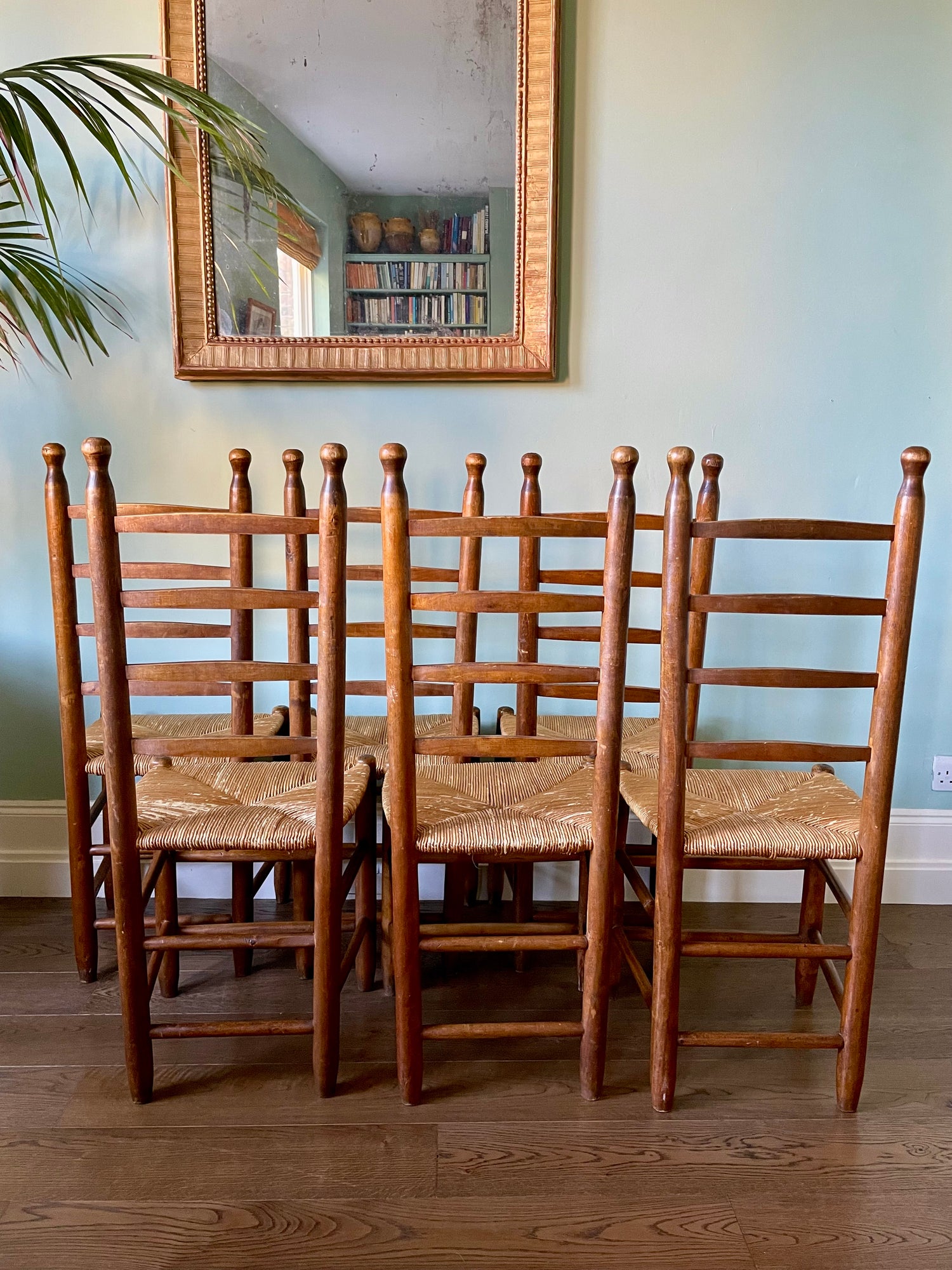 Six 1940s French Farmhouse Rush Seat Dining Chairs